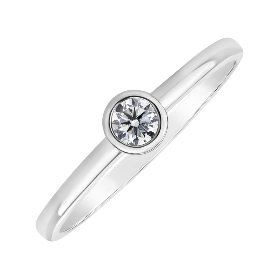 Jemný prsten z bílého, žlutého nebo růžového 14kt zlata. Zajímavě zasazený briliant kulatého brusu je spojením tradičního zásnubního prstýnku s praktičností hladkého tvaru. Šperk je vhodný pro žádost o ruku i jako krásný dárek.