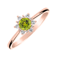 Něžný design hvězdy na zlatém prstenu, který se třpytí diamanty. To je skvostný šperk s peridotem vyroben ze 14kt zlata vhodný při originální žádosti o ruku či jako zajímavý dárek.