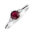 Luxusní prsten s centrálním rubíbem je z každé strany doplněný čirým briliantem. Jemný prsten je vyroben ze 14-karátového bílého zlata. Šperk je úžasný jako zásnubní prsten nebo okouzlující dárek.