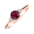 Luxusní prsten s centrálním rubínem je z každé strany doplněný čirým briliantem. Jemný prsten je vyroben ze 14-karátového růžového zlata. Šperk je úžasný jako zásnubní prsten nebo okouzlující dárek.