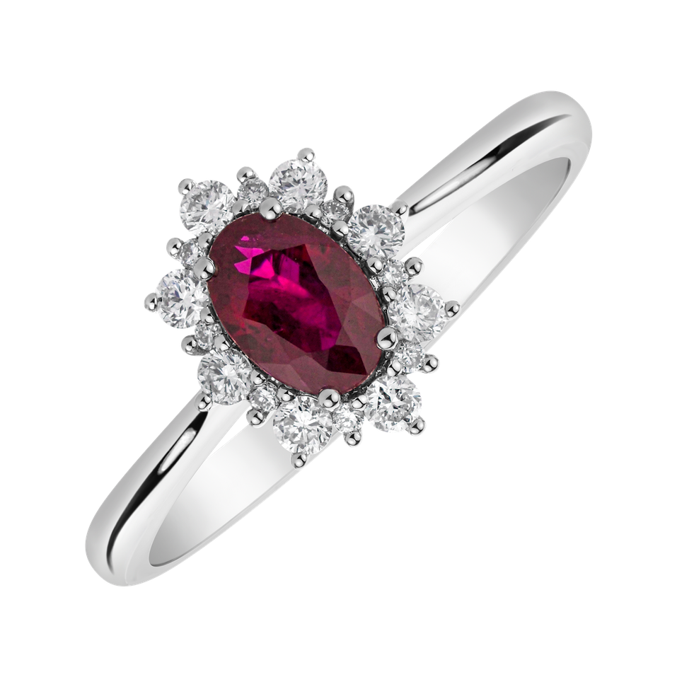 Oválný rubín obklopený třpytivými diamanty na jemné zlaté obroučce působí doslova královsky. Prsten, se kterým se vaše vyvolená bude cítit jako princezna!