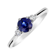 Luxusní prsten s centrálním safírem je z každé strany doplněný čirým briliantem. Jemný prsten je vyroben ze 14-karátového bílého zlata. Šperk je úžasný jako zásnubní prsten nebo okouzlující dárek.