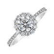 Šperk, které okouzlí každou ženu. Úchvatný prsten vyrobený z bílého 14-karátového zlata v designu halo s centrálním diamantem obklopeným drobnými brilianty.