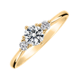 Luxusní prsten s centrálním diamantem je z každé strany doplněný čirým briliantem. Jemný prsten je vyroben ze 14-karátového žlutého zlata. Šperk je úžasný jako zásnubní prsten nebo okouzlující dárek.