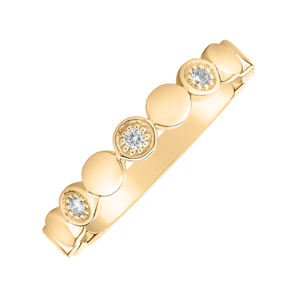 Jedinečný prsten ze 14-karátového zlata zdobený brilianty. Něžné okrouhlé linie prstenu spolu s drobnými diamanty mu dodávají jemnost a lesk. Díky svému minimalistickému designu je ideální pro každodenní nošení.